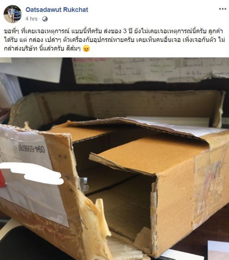 เรียกได้ว่าเป็นเรื่องราวที่มีคนแห่พูดถึงและเข้ามาแสดงความคิดเห็นกันเป็นจำนวนมาก ผู้ใช้เฟซบุ๊ค Oatsadawut Rukchat เจ้าของร้านขายโทรศัพท์มือถือ มือ2 ที่สมุทรปราการเเละมหาสารคาม โพสต์เหตุดารณ์ที่ไม่คาดคิดระหว่างส่งมือถือไปให้ลูกค้า ขอพี่ๆ ที่เคยเจอเหตุการณ์ แบบนี้ทีครับ ส่งของ 3 ปี ยังไม่เคยเจอเหตุการณ์นี้ครับ ลูกค้าได้รับ แต่ กล่อง เปล่าๆ ตัวเครื่องกับอุปกรณ์หายครับ เคยเห็นคนอื่นเจอ เพิ่งเจอกันตัว ไม่กล้าส่งบริษัท นี้แล้วครับ สีส้มๆ