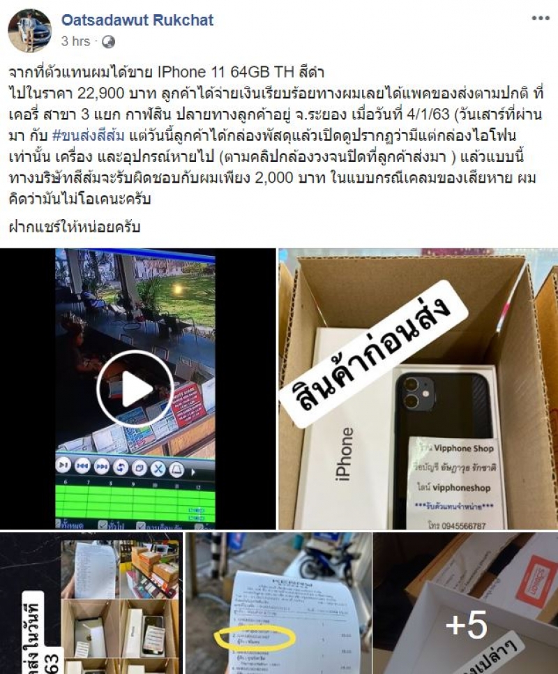 จากที่ตัวแทนผมได้ขาย IPhone 11 64GB TH สีดำ ไปในราคา 22900 บาท ลูกค้าได้จ่ายเงินเรียบร้อยทางผมเลยได้แพคของส่งตามปกติ ที่เคอรี่ สาขา 3 แยก กาฬสิน ปลายทางลูกค้าอยู่ จังหวัดระยอง เมื่อวันที่ 4 มกราคม 63 วันเสาร์ที่ผ่านมา กับ ขนส่งสีส้ม แต่วันนี้ลูกค้าได้กล่องพัสดุแล้วเปิดดูปรากฏว่ามีแต่กล่องไอโฟนเท่านั้น เครื่อง และอุปกรณ์หายไป ตามคลิปกล้องวงจนปิดที่ลูกค้าส่งมา แล้วแบบนี้ทางบริษัทสีส้มจะรับผิดชอบกับผมเพียง 2000 บาท ในแบบกรณีเคลมของเสียหาย ผมคิดว่ามันไม่โอเคนะครับ