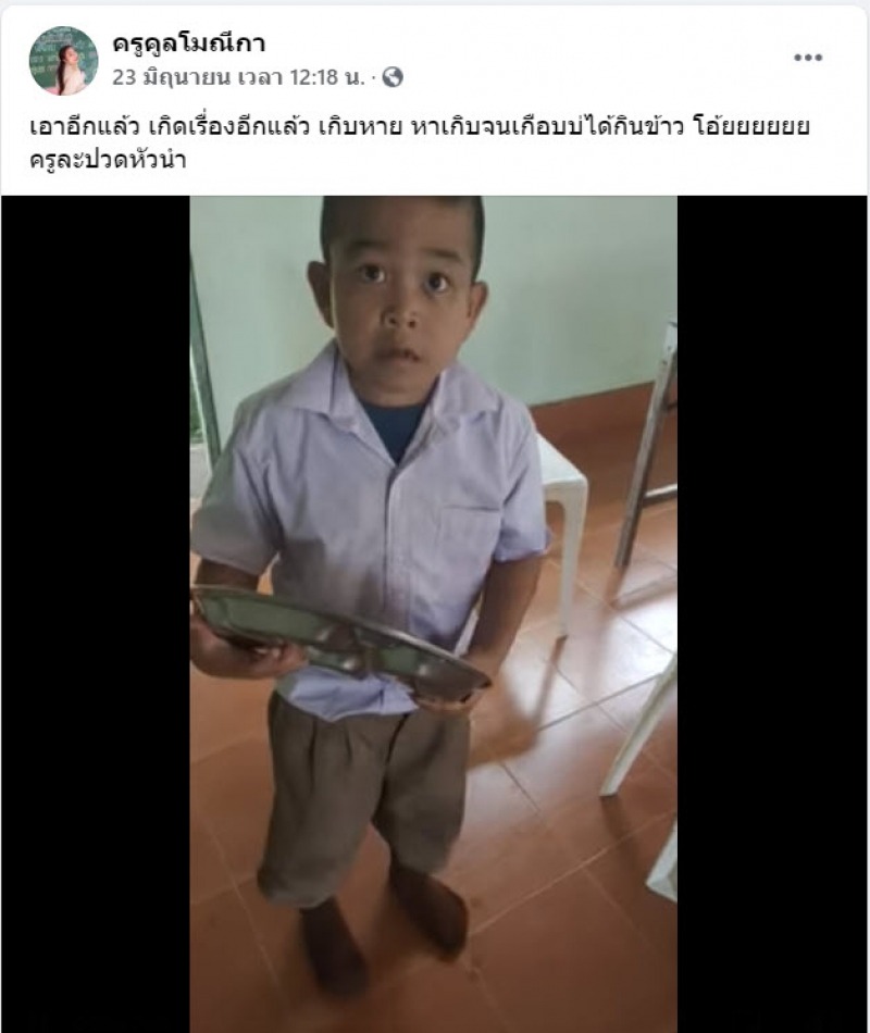 ทั้งนี้ผู้ใช้เฟสบุ๊คดังกล่าวยังได้ระบุข้อความว่า เอาอีกแล้ว เกิดเรื่องอีกแล้ว เกิบหาย หาเกิบจนเกือบบ่ได้กินข้าว โอ้ยยยยยย ครูละปวดหัวนำ