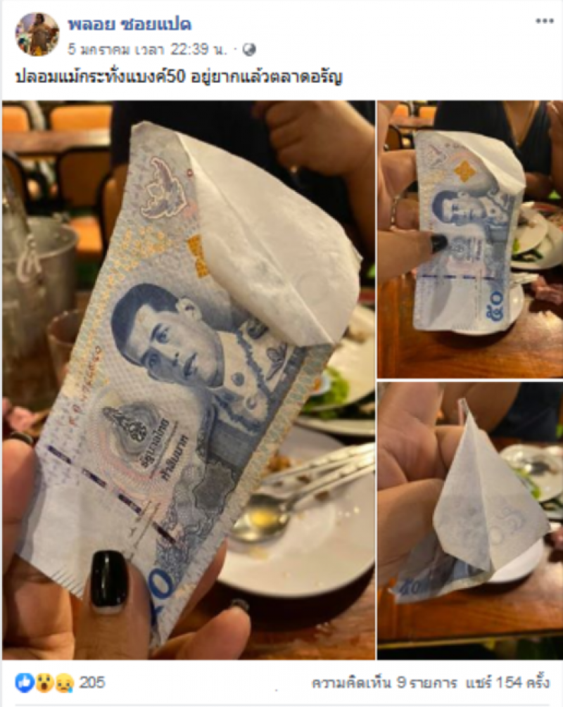 เรียกได้ว่าเป็นเรื่องราวที่มีคนต่างเข้ามาแสดงความคิดเห็นกันเป็นจำนวนมาก และต้องบอกเลยว่าในช่วงนี้แบงค์ปลอมมีอยู่เยอะมาก ส่วนมากก็จะเจอแบงค์พัน แต่ล่าสุดไม่ใช่แล้ว ปลอมทุกแบงค์จริงๆ โดยเมื่อวันที่ 5 มกราคม 2563 ได้มีผู้ใช้เฟสบุ๊คที่ใช้ชื่อว่า พลอย ซอยแปด ได้โพสต์ภาพแบงค์50ปลอม โดยได้ระบุข้อความว่า ปลอมแม้กระทั่งแบงค์50 อยู่ยากแล้วตลาดอรัญ
