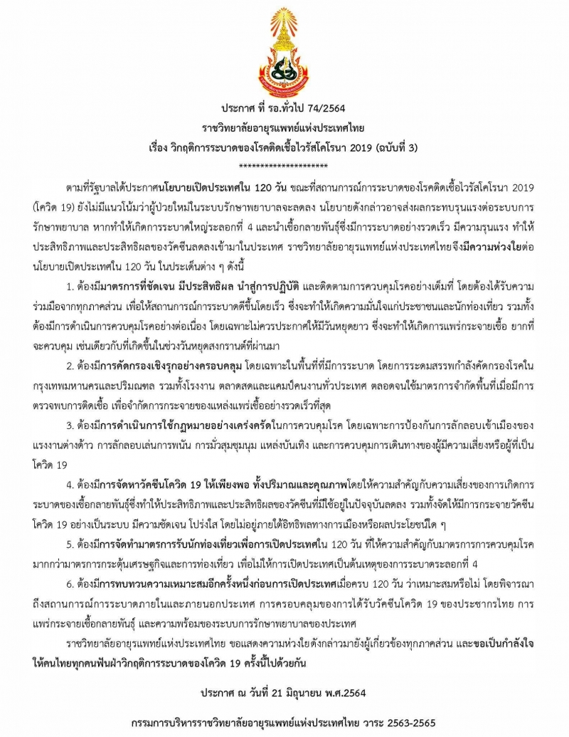 โดยระบุว่า ตามที่รัฐบาลได้ประกาศนโยบายเปิดประเทศใน 120 วัน ขณะที่สถานการณ์การ ร ะ บ า ด ยังไม่มีแนวโน้มว่าผู้ ป่ ว ย ใหม่ในระบบรักษาพยาบาลจะลดลง นโยบายดังกล่าวอาจส่งผลกระทบ รุ น แ ร งต่อระบบการรักษา พ ย า บ า ล หากทำให้เกิดการ ร ะ บ า ด ใหญ่ระลอกที่ 4 และนำ เ ชื้ อ กลายพันธุ์ซึ่งมีการ ร ะ บ า ด อย่างรวดเร็ว มีความรุนแรง ทำให้ประสิทธิภาพและประสิทธิผลของ วั ค ซี น ลดลงเข้ามาในประเทศ ราชวิทยาลัยอายุรแพทย์แห่งประเทศไทยจึงมีความห่วงใยต่อนโยบายเปิดประเทศใน 120 วัน ในประเด็นต่าง ๆ ดังนี้