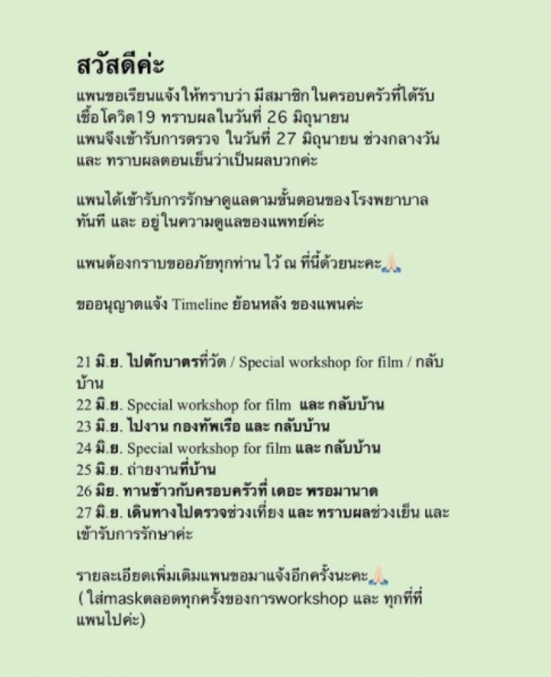 จากกรณีนางเอกสาว แพนเค้ก เขมนิจ ได้ประกาศ ติ ด เ ชื้ อ โ ค วิ ด-19 ผ่านอินสตราเเกรมส่วนตัวของเธอ โดยระบุว่า แพนขอเรียนแจ้งให้ทราบว่า มีสมาชิกในครอบครัวที่รับ เ ชื้ อ โ ค วิ ด-19 ทราบผลในวันที่ 26 มิถุนายน แพนจึงเข้ารับการตรวจในวันที่ 27 มิถุนายน ช่วงกลางวันค่ะ และทราบผลตอนเย็น ว่าผลเป็นผลบวกค่ะ