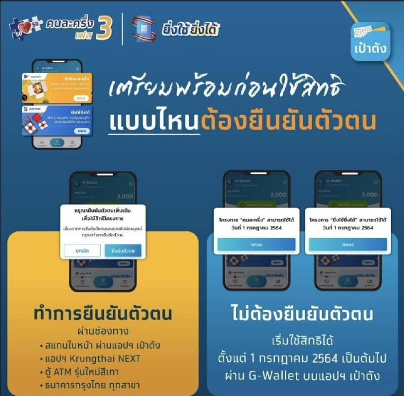 ทั้งนี้ ผู้รับสิทธิรายใหม่ จะต้องดำเนินการยืนยันตัวตนทุกคน ส่วนผู้รับสิทธิรายเดิมบางคน อาจจะต้องยืนยันตัวตนเพิ่มเติมอีกครั้ง โดยเมื่อกดเข้า G-wallet ระบบจะขึ้นข้อความว่า “กรุณายืนยันตัวตนเพิ่มเติม เพื่อใช้สิทธิในโครงการ เนื่องจากการยืนยันตัวตนของคุณยังไม่สมบูรณ์” ให้ยืนยันตัวตน โดยสแกนใบหน้า ผ่านแอปฯ เป๋าตัง หรือแอปฯ Krungthai NEXT หรือ นำบัตรประชาชนไปยืนยันตัวตนที่ ตู้เอทีเอ็มกรุงไทยสีเทา หรือ ธนาคารกรุงไทยทุกสาขาทั่วประเทศ