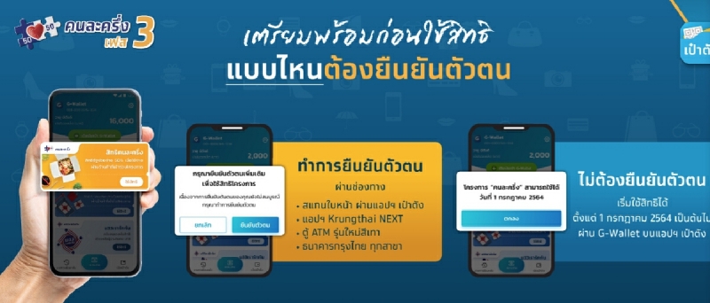 กรุงไทยเผยขั้นตอนเตรียมความพร้อม ก่อนใช้สิทธิโครงการคนละครึ่งเฟส 3 ในวันที่ 1 กรกฎาคม 2564 นี้ ทั้งดาวน์โหลดแอปฯ เป๋าตัง เพื่อเปิดใช้งาน G-Wallet ยืนยันตัวตน พร้อมให้ความยินยอมใช้ข้อมูลส่วนบุคคลพิสูจน์ตัวตน เพื่อเข้าร่วมโครงการ