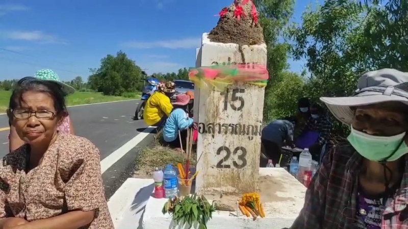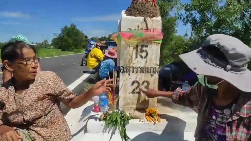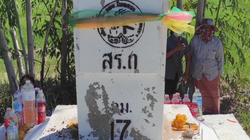 วันนี้ (28 มิ.ย.) ที่บริเวณถนนเส้นทาง 214 สาย อ.ท่าตูม จ.สุรินทร์ -อ.สุวรรณภูมิ จ.ร้อยเอ็ด บริเวณหลักกิโลเมตรที่ 17 ปากทางไปบ้านขี้เหล็ก ต.โพนครก อ.ท่าตูม จ.สุรินทร์ เข้าไปประมาณ 1 กิโลเมตร ได้มีชาวบ้านเป็นจำนวนมากต่างพากันเดินทางมาที่หลักกิโลเมตรแห่งนี้