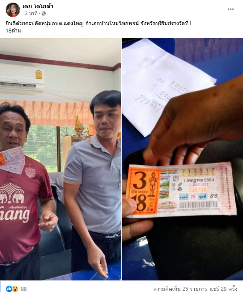 ล่าสุดเฟสบุ๊ค เตย โตโยต้า ได้ออกมาคนถูกรางวัลที่ 1 โดยได้ระบุข้อความว่า ยินดีด้วยค่ะปลัดหนุ่มอบต.แดงใหญ่ อำเภอบ้านใหม่ไชยพจน์ จังหวัดบุรีรัมย์รางวัลที่1 18ล้าน