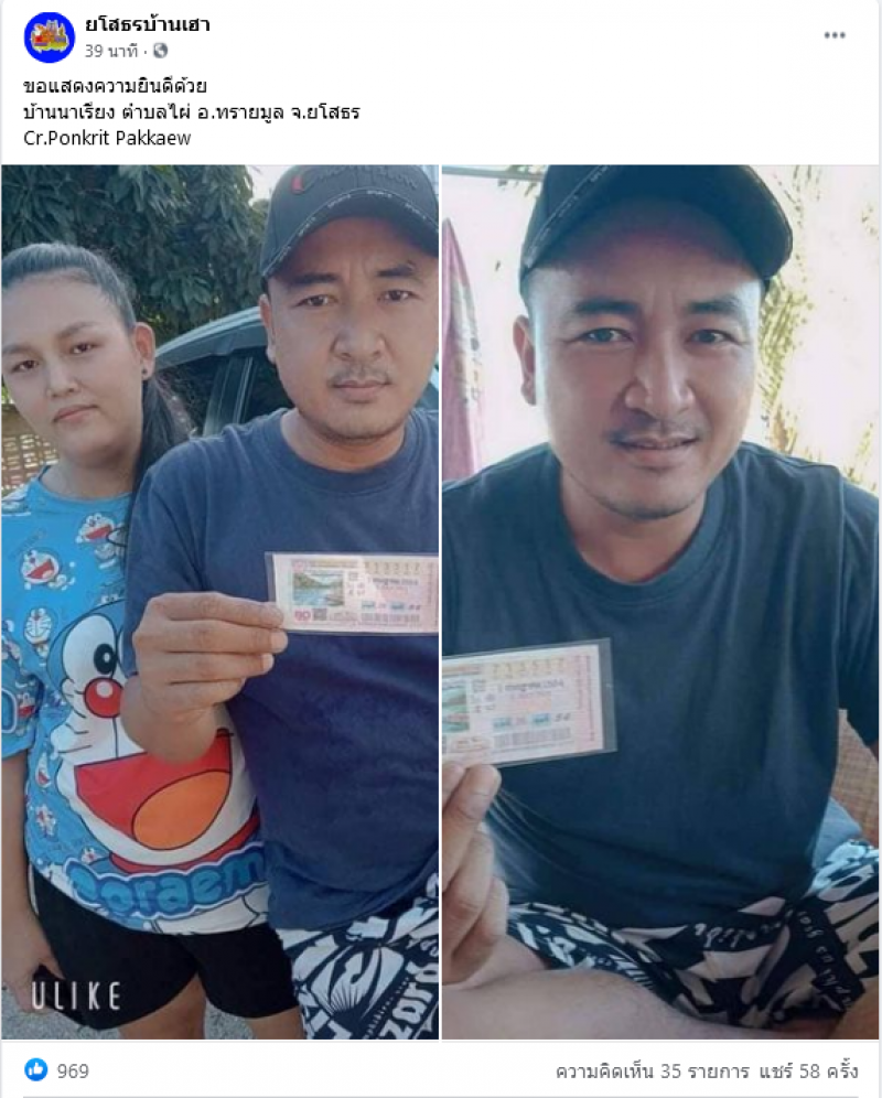 ล่าสุด เพจเฟสบุ๊คชื่อ ยโสธรบ้านเฮาได้ออกมาโพสต์คนถูกรางวัลที่ 1 โดยได้ระบุข้อความว่าขอแสดงความยินดีด้วย บ้านนาเรียง ตำบลไผ่ อ.ทรายมูล จ.ยโสธร