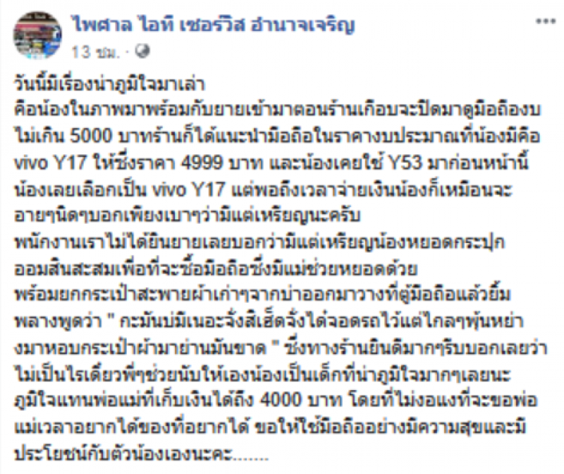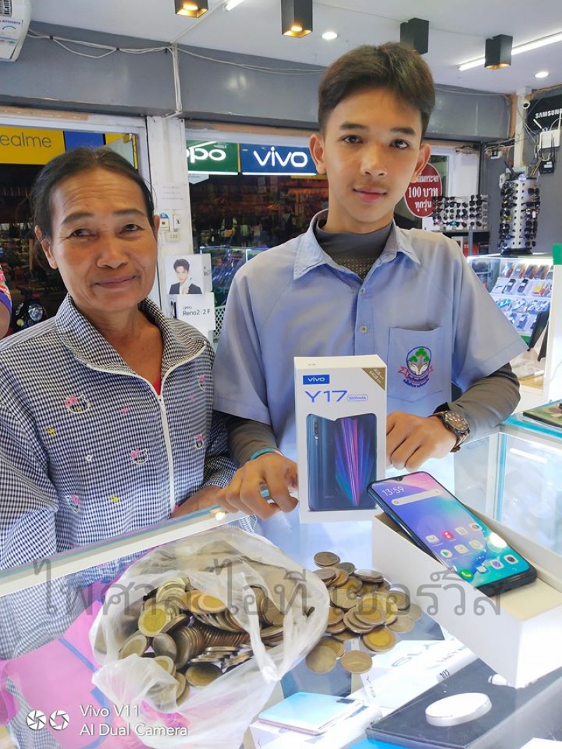 เรียกได้ว่าเป็นอีกหนึ่งเรื่องราวที่มีคนต่างพูดถึงและเข้ามาแสดงความคิดเห็นกันเป็นจำนวนมาก อีกทั้งยังชื่นชมว่าหนุ่มน้อยคนนี้น่าเอาเป็นตัวอย่างที่สามารถเก็บเงิน เก็บหอมรอมริบจนได้ของที่ตัวเองอยากได้ไม่ไปรบกวนผู้ใหญ่ โดยทางเพจที่ใช้ชื่อว่า ไพศาล ไอที เซอร์วิส อำนาจเจริญ ได้โพสต์ภาพครอบครัวหนึ่ง โดยได้ระบุข้อความว่า วันนี้มีเรื่องน่าภูมิใจมาเล่า คือน้องในภาพมาพร้อมกับผู้ปกครองเข้ามาตอนร้านเกือบจะปิดมาดูมือถืองบไม่เกิน 5000 บาทร้านก็ได้แนะนำมือถือในราคางบประมาณที่น้องมีคือ vivo Y17 ให้ซึ่งราคา 4999 บาท และน้องเคยใช้ Y53 มาก่อนหน้านี้ น้องเลยเลือกเป็น vivo Y17 แต่พอถึงเวลาจ่ายเงินน้องก็เหมือนจะอายๆนิดๆบอกเพียงเบาๆว่ามีแต่เหรียญนะครับ พนักงานเราไม่ได้ยินยายเลยบอกว่ามีแต่เหรียญน้องหยอดกระปุกออมสินสะสมเพื่อที่จะซื้อมือถือซึ่งมีแม่ช่วยหยอดด้วย พร้อมยกกระเป๋าสะพายผ้าเก่าๆจากบ่าออกมาวางที่ตู้มือถือแล้วยิ้ม พลางพูดว่า กะมันบ่มีเนอะจั่งสิเฮ็ดจั่งได๋จอดรถไว้แต่ไกลๆพุ้นหย่างมาหอบกระเป๋าผ้ามาย่านมันขาด ซึ่งทางร้านยินดีมากๆรีบบอกเลยว่าไม่เป็นไรเดี๋ยวพี่ๆช่วยนับให้เองน้องเป็นเด็กที่น่าภูมิใจมากๆเลยนะภูมิใจแทนพ่อแม่ที่เก็บเงินได้ถึง 4000 บาท โดยที่ไม่งอแงที่จะขอพ่อแม่เวลาอยากได้ของที่อยากได้ ขอให้ใช้มือถืออย่างมีความสุขและมีประโยชน์กับตัวน้องเองนะคะ