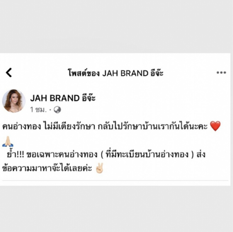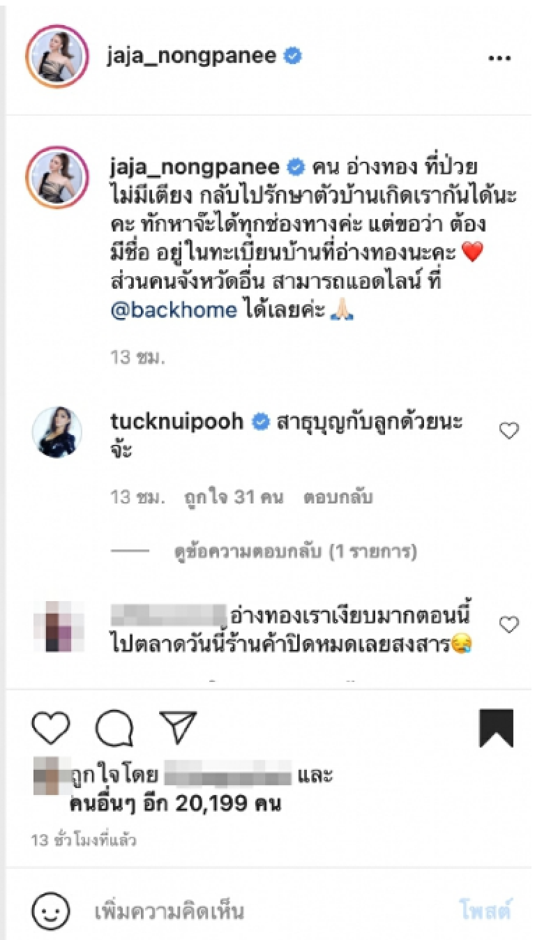 เธอนั้นได้โพสต์ระบุข้อความว่า "คน อ่างทอง ที่ ป่ ว ย ไม่มีเตียง กลับไปรักษาตัวบ้านเกิดเรากันได้นะคะ