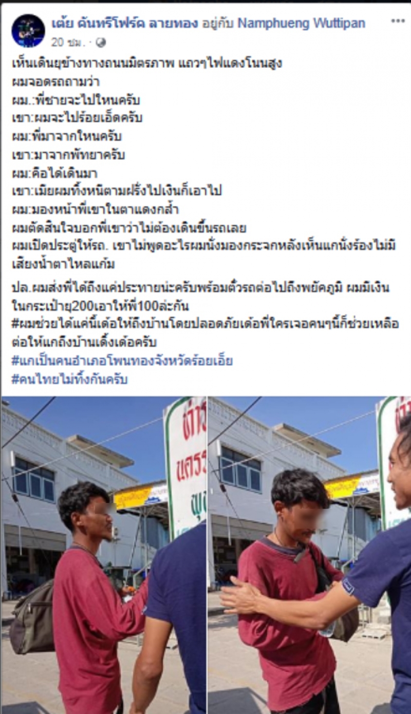 ผมช่วยได้แค่นี้เด้อให้ถึงบ้านโดยปลอดภัยเด้อพี่ใครเจอคนๆนี้ก็ช่วยเหลือต่อให้แกถึงบ้านเดิ้งเด้อครับ แกเป็นคนอำเภอโพนทองจังหวัดร้อยเอ็ย แกเป็นคนอำเภอโพนทองจังหวัดร้อยเอ็ด คนไทยไม่ทิ้งกันครับคนไทยไม่ทิ้งกันครับ