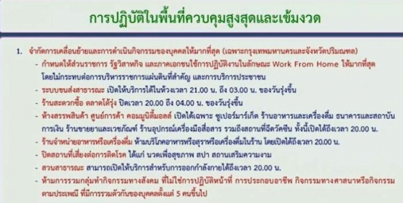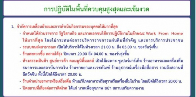 โดยมติที่ประชุมเห็นชอบการปรับระดับพื้นที่สถานการณ์ คือ พื้นที่ควบคุมสูงสุดและเข้มงวด 10 จังหวัด คือ กทม. นครปฐม นราธิวาส นนทบุรี ปทุมธานี ปัตานี ยะลา สมุทรปราการ สมุทรสาคร และสงขลา โดยมาตรการออกจากบ้านหลัง 21.00 น. จะให้ออกจากเคหะสถานเฉพาะผู้ที่มีความจำเป็นเท่านั้น มีข้อปฏิบัติดังนี้