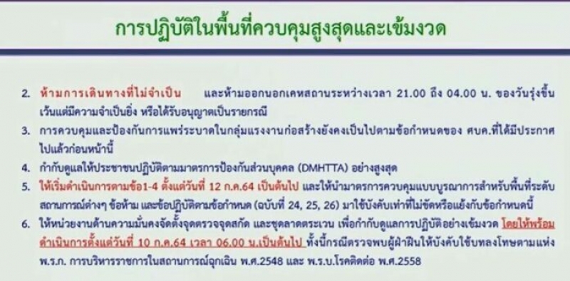 (10 จังหวัด : กรุงเทพฯ นนทบุรี ปทุมธานี นครปฐม สมุทรปราการ มุทรสาคร สงขลา ยะลา ปัตตานี นราธิวาส) ท้ังน้ี “ให้พร้อมดำเนินการต้ังแต่วันที่ 10 ก.ค.64 เวลา 06.00 น. เป็นต้นไป” โดยอาศัยอำนาจตามข้อกำหนด ฉบับที่ 25