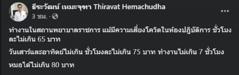 โดย ศ.นพ.ธีระวัฒน์ ได้ระบุในเพจว่า ทำงานในสถานพยาบาลราชการ แม้มีความ เ สี่ ย ง โ ค วิ ด ในห้องปฎิบัติการ ชั่วโมงละไม่เกิน 65 บาท วันเสาร์และอาทิตย์ไม่เกิน ชั่วโมงละไม่เกิน 75 บาท ทำงานไม่เกิน 7 ชั่วโมง หมอได้ไม่เกิน 80 บาท"