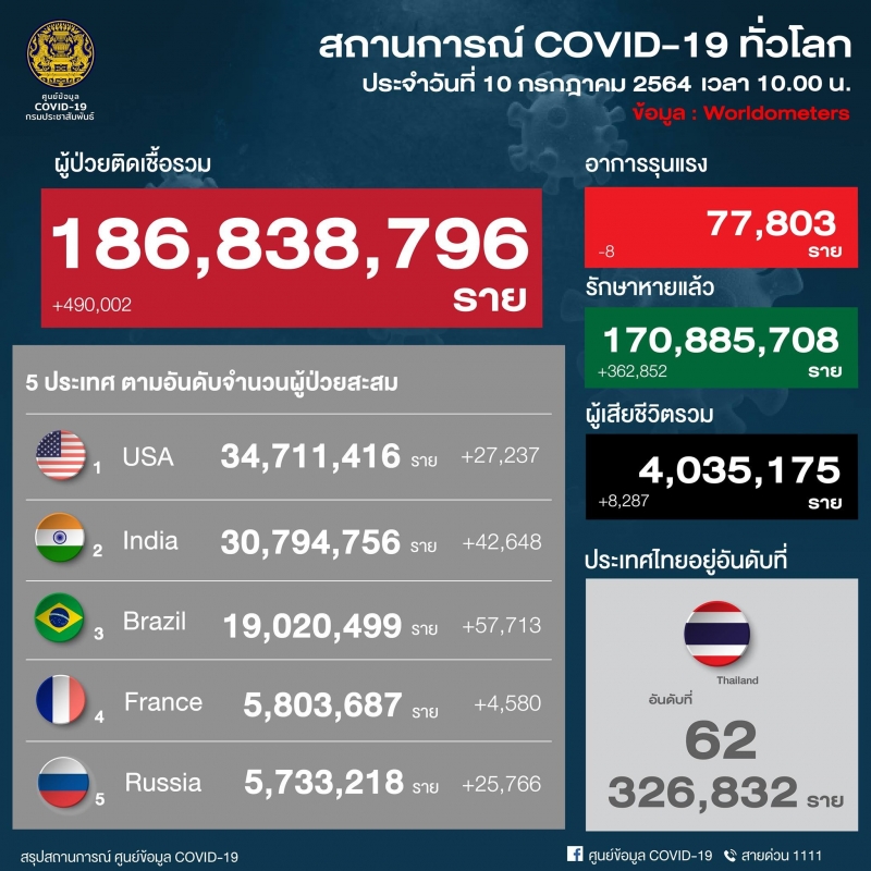 ขณะที่ สถานการณ์ ติ ด เ ชื้ อ C O V I D -19 ทั่วโลก เวลา 10.00 น. ยอดผู้ ติ ด เ ชื้ อ รวม 186,838,796 ราย รักษาหายแล้ว 170,885,708 ราย เ สี ย ชี วิ ต 4,035,175 ราย