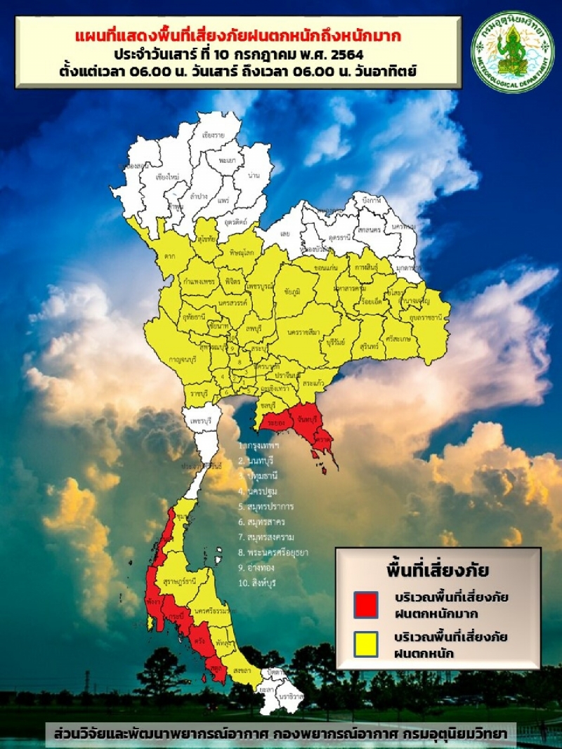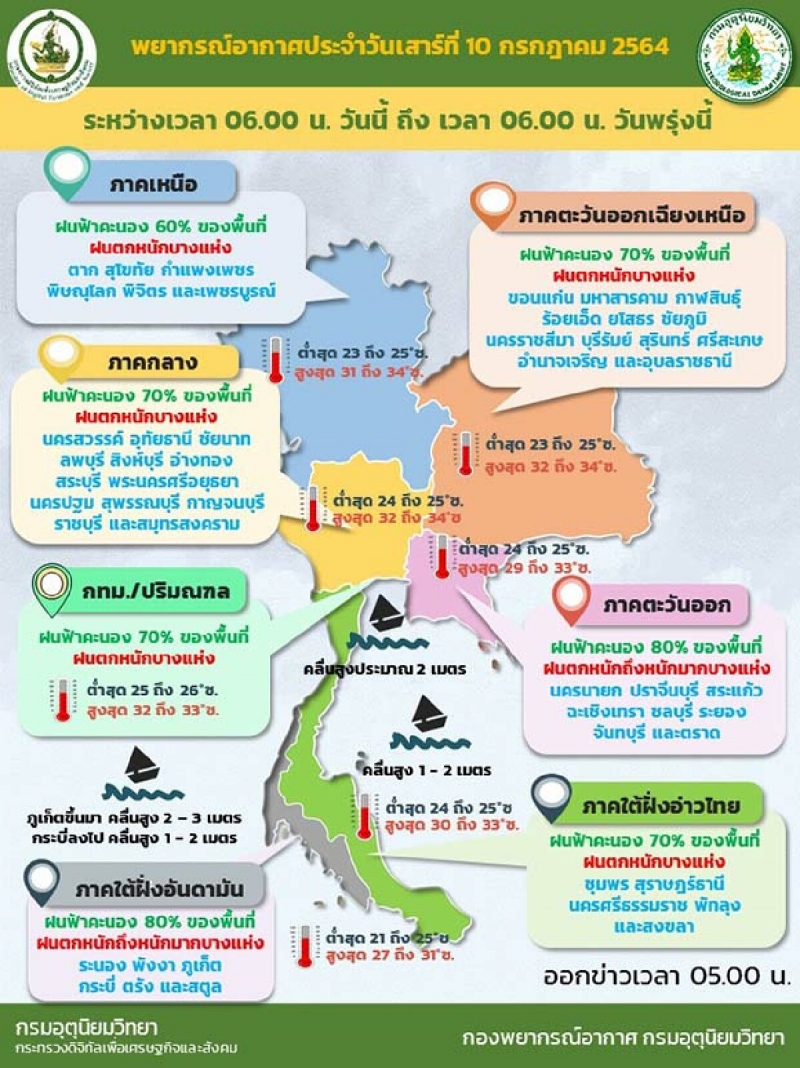 วันที่ 10 ก.ค.64 กรมอุตุนิยมวิทยา พยากรณ์อากาศ 24 ชั่วโมงข้างหน้า มีร่องมรสุมพาดผ่านภาคกลางและภาคตะวันออกเฉียงเหนือ ประกอบกับมรสุมตะวันตกเฉียงใต้กำลังค่อนข้างแรงพัดปกคลุมทะเลอันดามัน ประเทศไทย และอ่าวไทย ทำให้ประเทศไทยมีฝนตกต่อเนื่อง