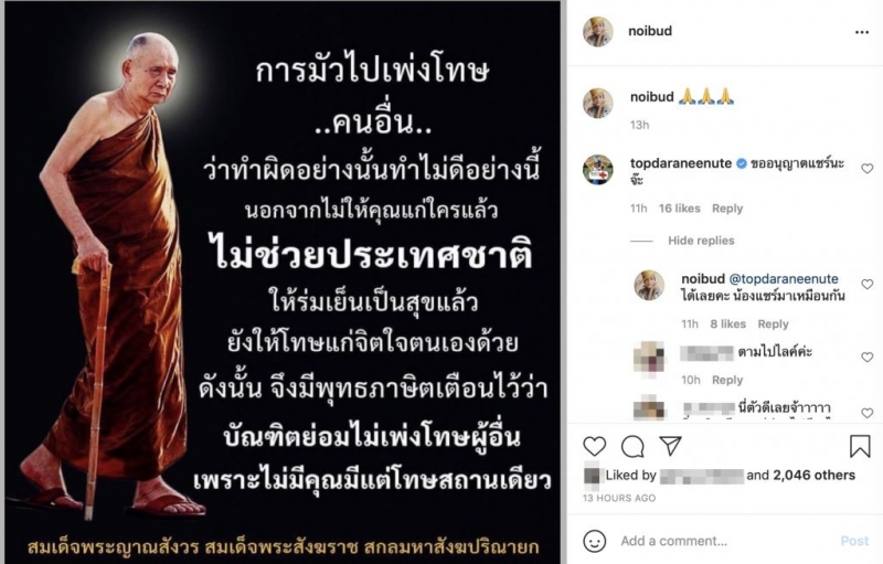 รวมถึงรายล่าสุดนักแสดงรุ่นใหญ่ ตุ๊ก เดือนเต็ม สาลิตุล ก็ได้ออกมาแชร์โพสต์ดังกล่าวด้วยเช่นเดียวกัน พร้อมกับระบุแคปชั่นยกมือไหม้ ด้าน ท็อป ดารณีนุช ก็เข้ามากดไลก์เช่นเคย