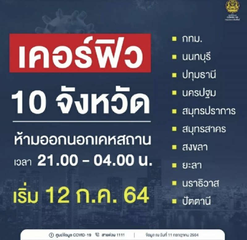 นอกจากนี้ศบค.ยังประกาศเคอร์ฟิว 10 จังหวัด ได้แก่ กรุงเทพมหานคร นครปฐม นนทบุรี ปทุมธานี สมุทรปราการ สมุทรสาคร นราธิวาส ปัตตานี ยะลา สงขลา ห้ามออกนอกเคหสถานในระหว่างเวลา 21.00 - 04.00 น. ของวันรุ่งขึ้น