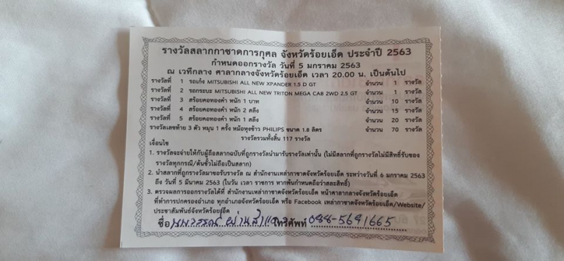 ก่อนอื่นต้องขอแสดงความยินดีก่อนเลยจ้า สำหรับสาวดวงเฮง เมื่อคืนวันที่ 5 มกราคม 2563 ที่ผ่านมา นายวันชัย คงเกษม ผู้ว่าราชการจังหวัดร้อยเอ็ด เป็นประธานในกิจกรรม สาเกตสานสัมพันธ์สามัคคี สวัสดีปีใหม่ 2563 ในงานประเพณีปีใหม่และกาชาดจังหวัดร้อยเอ็ด ประจำปี 2563 และเป็นประธานในการออกรางวัลสลากกาชาดการกุศล ณ เวทีกลางหน้าศาลากลางจังหวัดร้อยเอ็ด ซึ่งมีรางวัลใหญ่ รางวัลที่ 1 รถเก๋ง MITSUBISHI ALL NEW XPANDER 1 รางวัล สลากหมายเลข 68709 รางวัลที่ 2 รถกระบะ MITSUBISHI ALL NEW 1 รางวัล สลากหมายเลข 50135