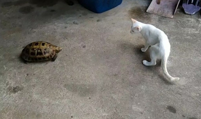 เต่าเผือกกระดองด่างตัวใหญ่ โผล่มาเล่นกับแมวขาว ท้ อ ง แก่