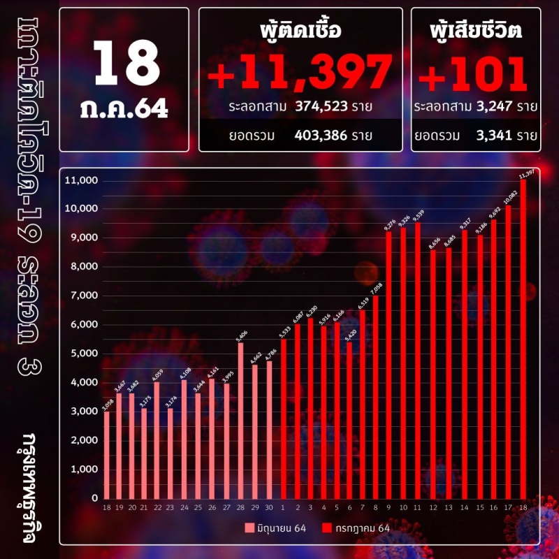 วันที่ 18 ก.ค. 64 ภาพรวมของการระบาดยังต้องคอยเฝ้าระวังอย่างใกล้ชิด หลังพบผู้ ติ ด เ ชื้ อ โ ค วิ ด- 1 9 รายใหม่อีก 11,397 ราย แบ่งเป็น ผู้ ติ ด เ ชื้ อ รายใหม่ 11,079 ราย และผู้ ติ ด เ ชื้ อ ในเรือนจำ 318 ราย