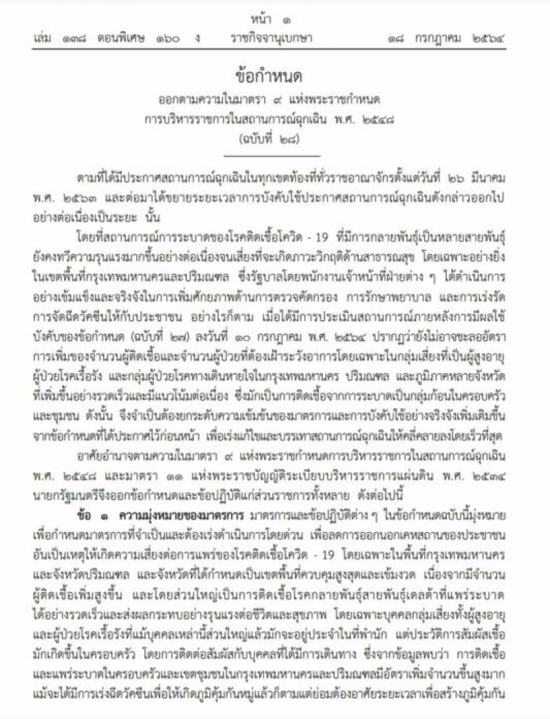 ข้อกำหนดและข้อบังคับในฉบับที่ 28 นี้ มีผลบังคับใช้ตั้งแต่ 20 ก.ค. (ยกเว้นระบบขนส่งสาธารณะ มีผล 21 ก.ค.) เป็นระยะเวลา 14 วัน ( ถึง 2 ส.ค. 64) ลงชื่อพล.อ.ประยุทธ์ จันทรโอชา