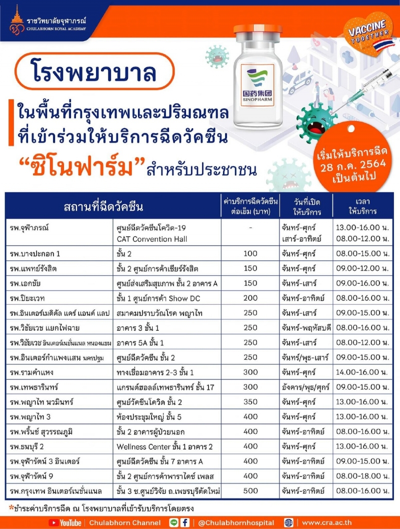 เช็ครายชื่อโรงบาล หลังจองซิโนฟาร์มกับราชวิทยาลัยจุฬาภรณ์