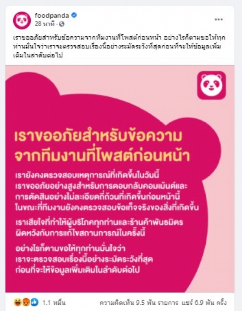 ล่าสุด ทางฟู้ดแพนด้า ต้องแถลงการณ์อีกครั้ง ระบุว่าจะมีการตรวจสอบอย่างระมัดระวัง เราขออภัยสำหรับข้อความจากทีมงานที่โพสต์ก่อนหน้า อย่างไรก็ตามขอให้ทุกท่านมั่นใจว่าเราจะตรวจสอบเรื่องนี้อย่างระมัดระวังที่สุดก่อนที่จะให้ข้อมูลเพิ่มเติมในลำดับต่อไป