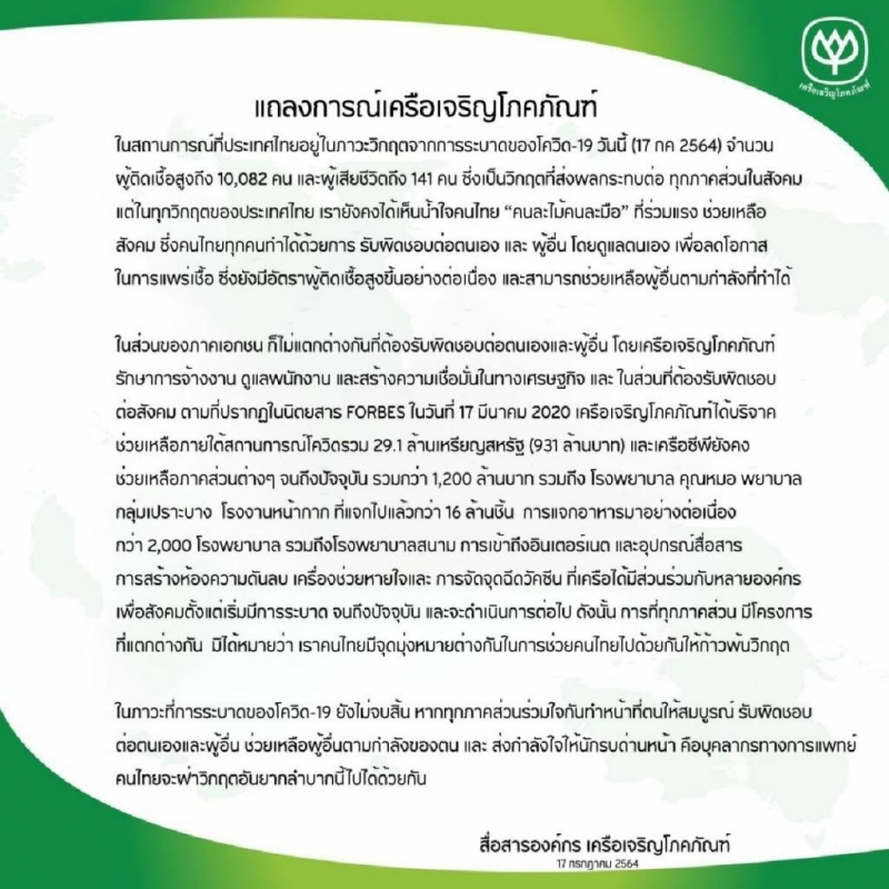และในเวลาต่อมาทางด้าน เจ้าสัวซีพี ก็ไม่ได้นิ่งนอนใจแต่อย่างใดกับเหตุการณ์ดังกล่าว ได้ออกมาแถลงการณ์สำคัญผ่านทางเพจเฟซบุ๊ก เครือเจริญโภคภัณฑ์ เอาไว้ดังนี้