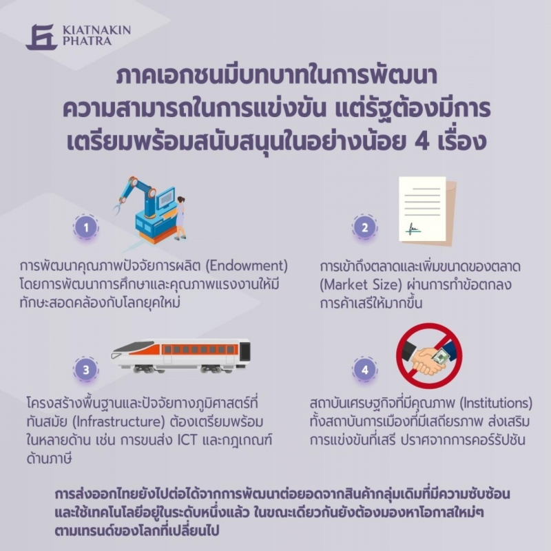 KKP Research ประเมินว่า เพื่อให้ประเทศไทยสามารถพัฒนาเศรษฐกิจและเทคโนโลยีได้ ภาคเอกชนมีบทบาทสำคัญในการพัฒนาความสามารถในการแข่งขัน และรัฐก็มีบทบาทสำคัญในการกำหนดทิศทาง ส่งเสริม และพัฒนาโครงสร้างพื้นฐานที่สำคัญใน 4 ด้าน คือ