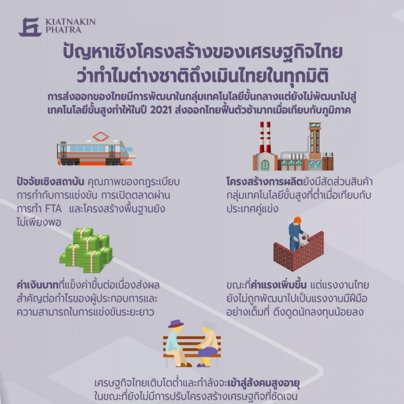 นอกจากนี้ปัจจัยเชิงโครงสร้างอื่นๆ โดยเฉพาะประเด็นการเข้าสู่สังคมสูงอายุที่เลี่ยงไม่ได้ จะเป็นอีกปัจจัยลบต่อการเติบโตระยะยาวของเศรษฐกิจทั้งมิติขนาดของตลาดและความพร้อมของแรงงาน ค่าเงินบาทที่แข็งค่าขึ้น การขาดการลงทุนเพื่อวิจัยและพัฒนาใหม่ๆ ทำให้ความน่าสนใจในการลงทุนในไทยลดน้อยลงไป