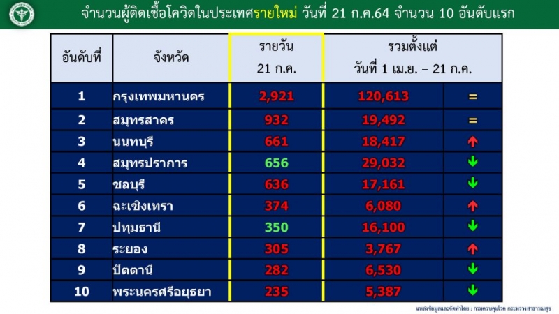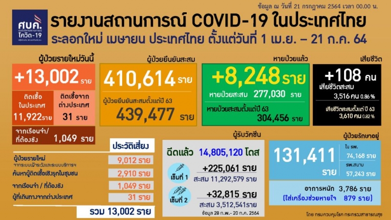 21ก.ค.64 ศบค.รายงานสถานการณ์ เ ชื้ อ โ ค วิ ด-19 ในประเทศไทย พบ ผู้ ติ ด เ ชื้ อ โ ค วิ ด รายใหม่อีก 13,002 ราย แยกเป็นผู้ ป่ ว ย รายใหม่จากระบบเฝ้าระวังและระบบบริการฯ 9,012 ราย ผู้ ป่ ว ย การค้นหาเชิงรุก 2,910 ราย ติ ด เ ชื้ อ ภายในเรือนจำ/ที่ต้องขัง 1,049 ราย ผู้ ติ ด เ ชื้ อ