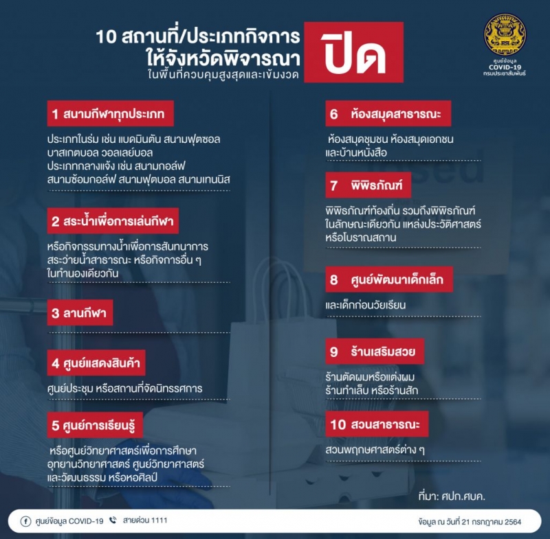 ยกเว้น 3สถานที่มีเหตุจำเป็นต้องเปิด ภายใต้มาตรการ ค ว บ คุ ม โ ร ค ในพื้นที่ควบคุมสูงสุดและเข้มง ว ด คือ