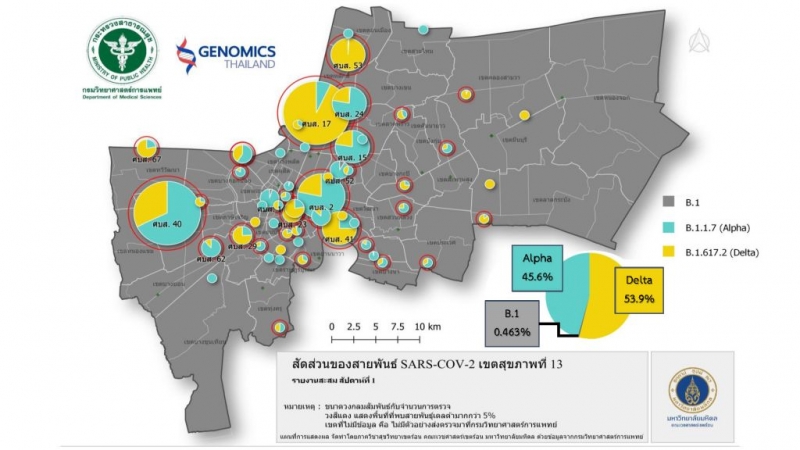 เเละได้พบการระบาดสายพันธุ์เดลตาเกิน 50% หรือเกินกว่าครึ่ง ในหลายจุด โดย 5 เขตใน กทม.ที่เป็นโควิดสายพันธุ์เดลตา หรือ สายพันธุ์อินเดีย เป็นหลัก ประกอบด้วย จตุจักร, บางรัก, จอมทอง, คลองเตย และหลักสี่ ซึ่ง กทม.พยายามจัดทีมแก้ไขเชิงรุกในชุมชนเพื่อค้นหาผู้ป่วยในชุมชนและรับการรักษาอย่างเร็วที่สุด