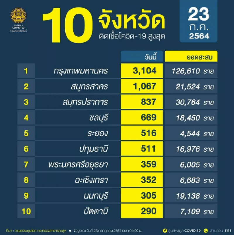 เพจศูนย์ข้อมูล C O V I D-19 ได้ประกาศ อันดับจังหวัดที่มีจำนวนผู้ติด เ ชื้ อ โ ค วิ ด ในประเทศรายใหม่สูงสุด วันที่ 23 กรกฎาคม 2564 โดยกรุงเทพมหานคร มียอดสุงถึง 3,104 ราย จับตาสมุทรสาคร-ปริมณฑล