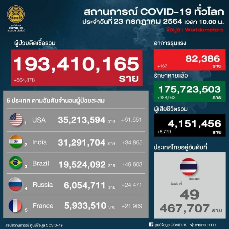 ประเทศไทย TH อยู่ในอันดับที่ 49 จำนวน 467,707 ราย
