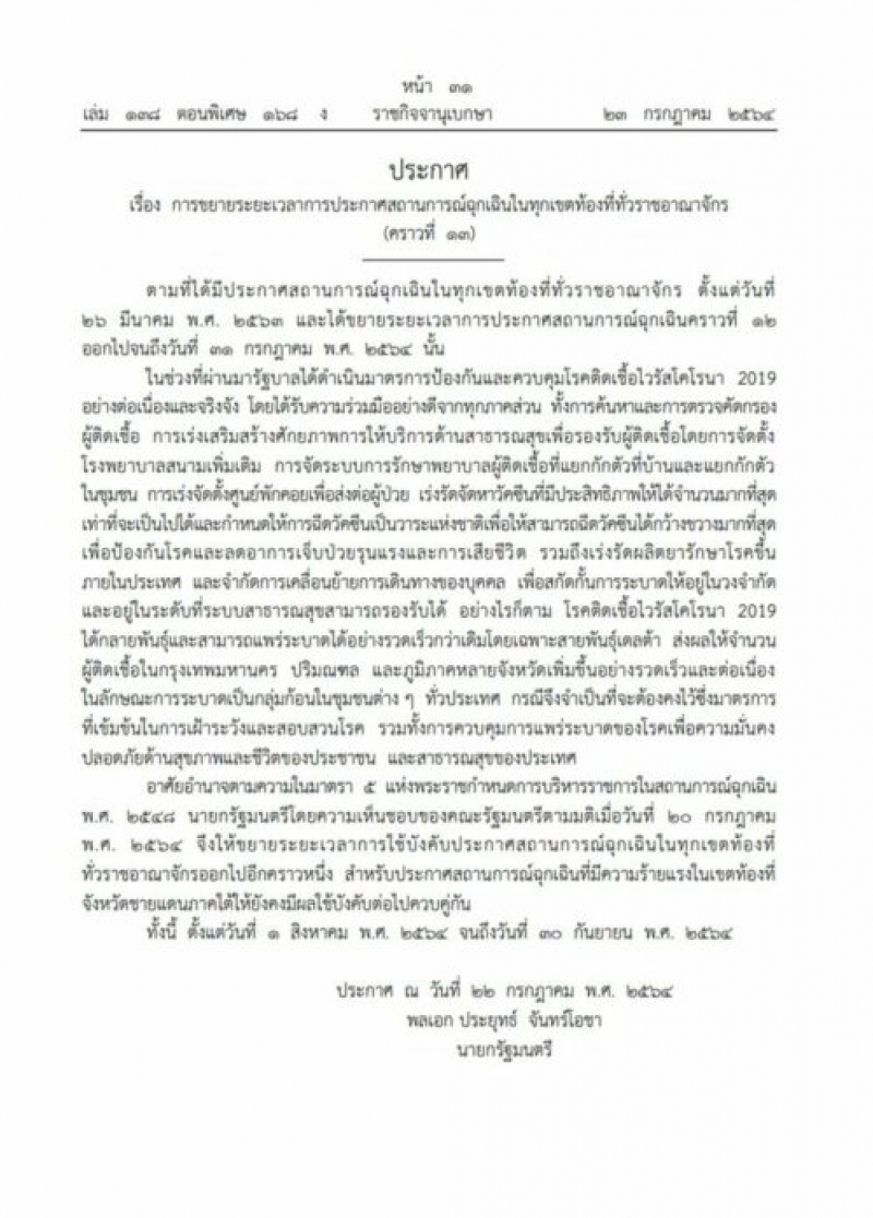 วันที่ 23 ก.ค.2564 เว็บไซต์ ราชกิจจานุเบกษา เผยแพร่ ประกาศเรื่อง การขยายระยะเวลาการประกาศสถานการณ์ฉุกเฉินในทุกเขตท้องที่ทั่วราชอาณาจักร (คราวที่ 13) มีใจความว่า ตามที่ได้มีประกาศสถานการณ์ฉุกเฉินในทุกเขตท้องที่ทั่วราชอาณาจักรตั้งแต่วันที่ 26 มีนาคม พ.ศ.2563 และได้ขยายระยะเวลาการประกาศสถานการณ์ฉุกเฉินคราวที่ 12 ออกไปจนถึงวันที่ 31 กรกฎาคม พ.ศ.2564 นั้น