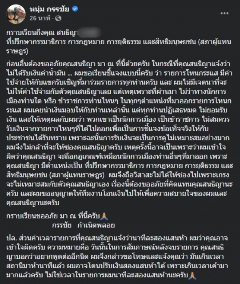 ผมจึงถือวิสาสะไม่ได้ให้ซองไปเพราะเกรงจะไม่เหมาะสมกับตัวคุณสนธิญาเอง เรื่องนี้ต้องขออภัยที่คิดแทนคุณสนธิญานะครับ และผมขออนุญาตให้ทีมงานโอนเงินไปให้เพื่อความสบายใจของผมและคุณสนธิญานะครับ