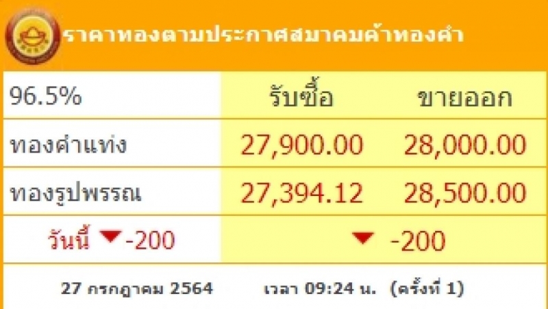 ราคาทองวันนี้อังคารที่ 27 กรกฎาคม 2564 ประกาศครั้งที่ 1 (เปิดตลาด) เมื่อเวลา 09.24 น. ปรับลงแรง 200 บาท ต้องบอกเลยว่าลงสุดในประวัติการในรอบสัปดาห์