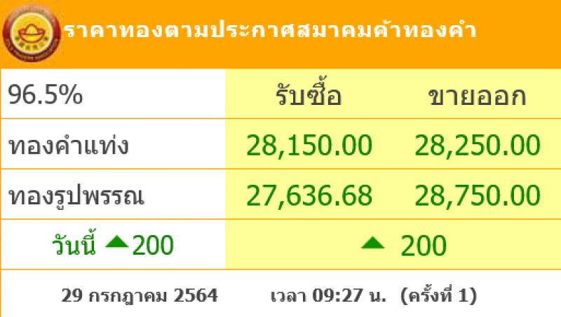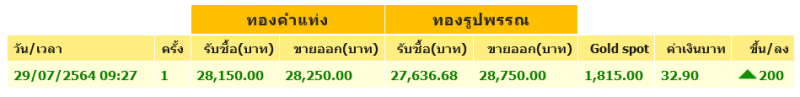 วันที่ 29 ก.ค. 2564 สมาคมค้าทองคำรายงานว่า ราคาทองไทยวันนี้ ครั้งที่ 1 เมื่อเวลา 09:27 น. ราคาทองคงที่ ส่งผลให้ ทองคำแท่ง รับซื้อบาทละ 28,150.00 ขายออกบาทละ27,636.68 บาท ส่วน ทองรูปพรรณ รับซื้อบาทละ 28,250.00 ขายออกบาทละ 28,750.00 บาท.