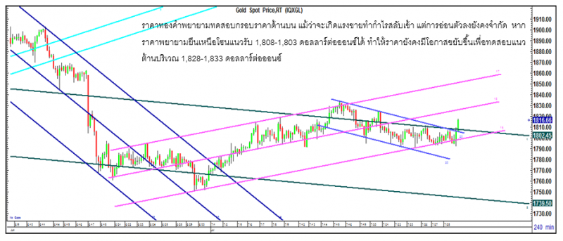 คำแนะนำ เข้าซื้อเพื่อเก็งกำไรระยะสั้นหากราคาทองคำสามารถยืนเหนือบริเวณ 1,808-1,803 ดอลลาร์ต่อออนซ์ได้ และทยอยปิดสถานะทำกำไรหากไม่ผ่านบริเวณแนวต้าน 1,828-1,833 ดอลลาร์ต่อออนซ์