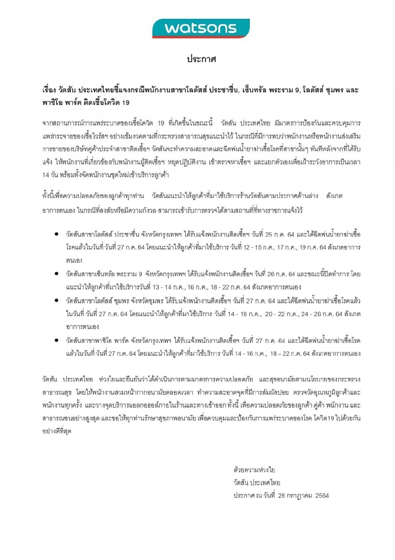 วัตสันประเทศไทย ออกหนังสือประกาศชี้แจงกรณีพนักงานวัตสัน 4 สาขา โลตัส ประชาชื่น, เซ็นทรัล พระราม 9, โลตัส ชุมพร และพาซิโอ พาร์ค ติด เ ชื้ อ โ ค วิ ด -19 ถึงกากรยกระดับมาตรการป้องกันและควบคุมขั้นสูงสุด