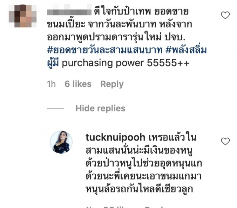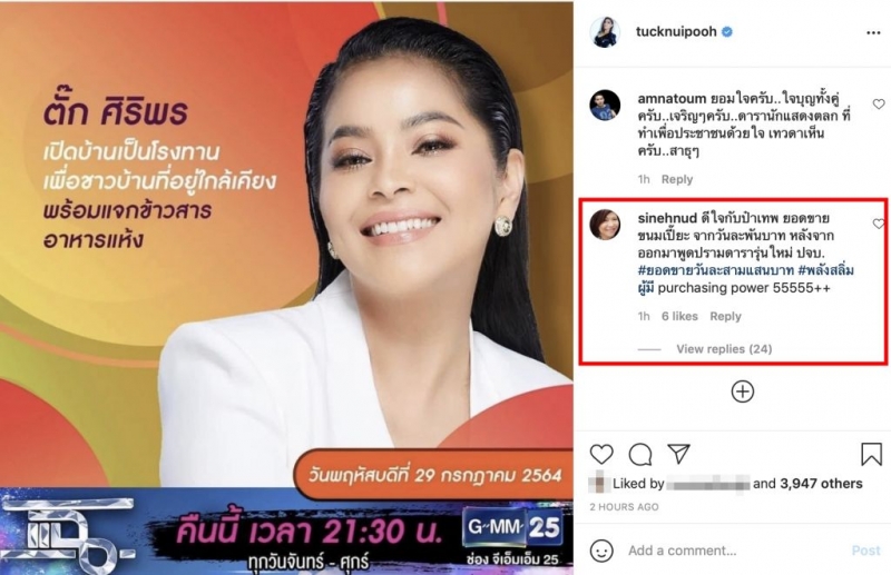 เรียกได้ว่าเป็นอีกหนึ่งประเด็นร้อน หลังมีชาวเน็ตรายหนึ่งเข้าไปคอมเมนต์กลางอินสตาแกรมของ ตั๊ก ศิริพร เอาไว้ว่า ดีใจกับป๋าเทพ ยอดขายขนมเปี๊ยะ จากวันละพันบาท หลังจากออกมาพูดปรามดารารุ่นใหม่ ปจบ. #ยอดขายวันละสามแสนบาท purchasing power 55555++