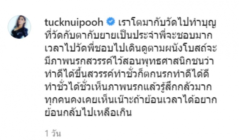ล่าสุด ตั๊ก ศิริพรด้ออกมาโพสต์ภาพ หลวงพ่อคูณ พร้อมกับแคปชั่นที่ชวนคิด โดยระบุข้อความว่า เราโตมากับวัดไปทำบุญที่วัดกับตากับยายเป็นประจำพี่จะชอบมากเวลาไปวัดพี่ชอบไปเดินดูตามผนังโบสถ์จะมี