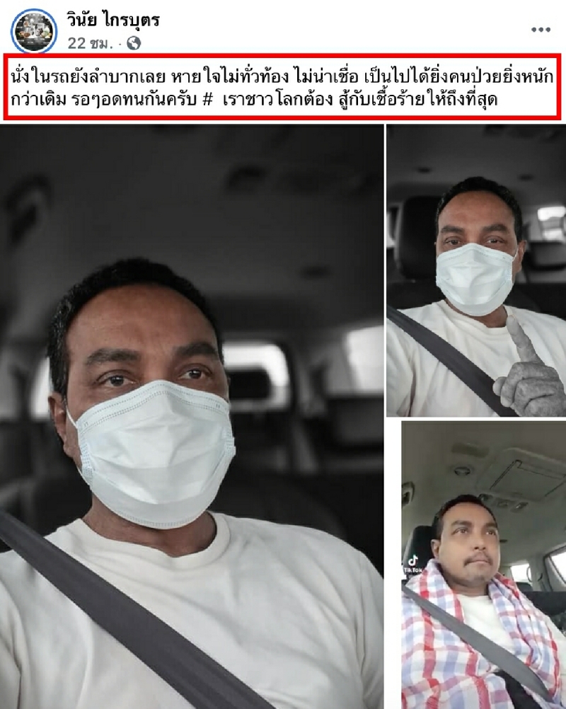 ล่าสุดจากสถานการณ์ โ ค วิ ด-19 ที่กำลัง ร ะ บ า ด อย่างหนักรวมถึงอารการ ป่ ว ย ของ เมฆ วินัย ก็ยังไม่ได้ดีขึ้น เจ้าตัวได้ออกมาโพสต์รูปภาพพร้อมกับข้อความ นั่งในรถยังลำบากเลย ห า ย ใ จ ไม่ทั่วท้อง ไม่น่าเชื่อ เป็นไปได้ยิ่งคน ป่ ว ย ยิ่งหนักกว่าเดิม รอๆอดทนกันครับ # เราชาวโลกต้อง สู้กับ เ ชื้ อ ร้ า ย ให้ถึงที่สุด ซึ่งก็มีทางด้านแฟนๆแห่เข้ามาให้กำลังใจกันเพียบ