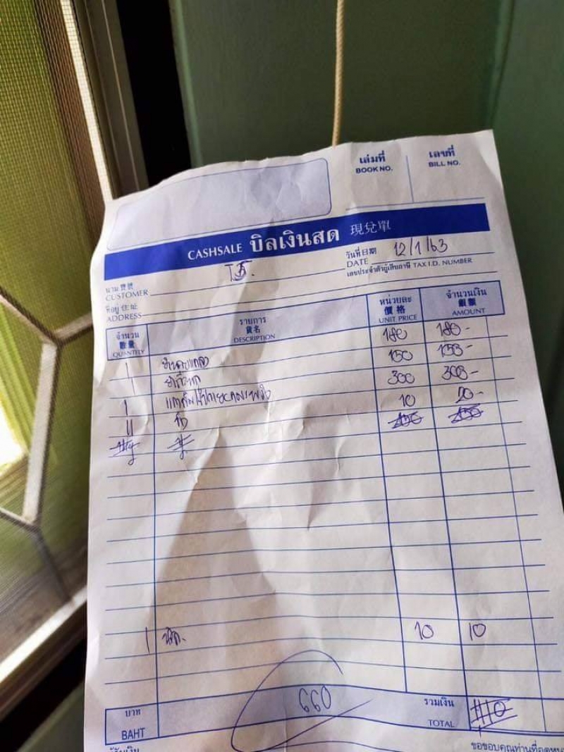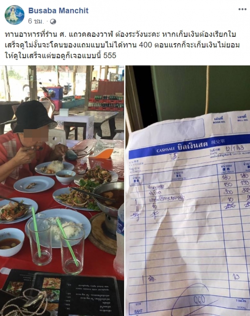 ผู้ใช้เฟซบุ๊กโพสต์ข้อความระบุว่า ทานอาหารที่ร้าน ศ แถวคลองวาฬ ต้องระวังนะคะ หากเก็บเงินต้องเรียกใบเสร็จดูไม่งั้นจะโดนของแถมแบบไม่ได้ทาน 400 ตอนแรกก็จะเก็บเงินไม่ยอมให้ดูใบเสร็จแต่ขอดูก็เจอแบบนี้ 555