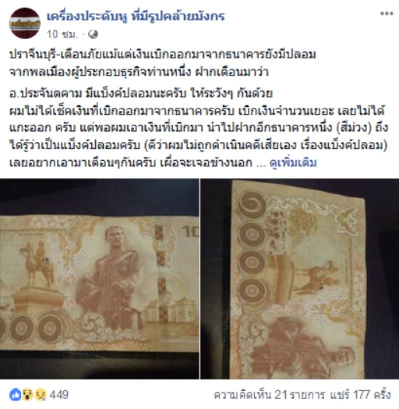 ปราจีนบุรี เตือนภัยแม้แต่เงินเบิกออกมาจากธนาคารยังมีปลอม จากพลเมืองผู้ประกอบธุรกิจท่านหนึ่ง ฝากเตือนมาว่า