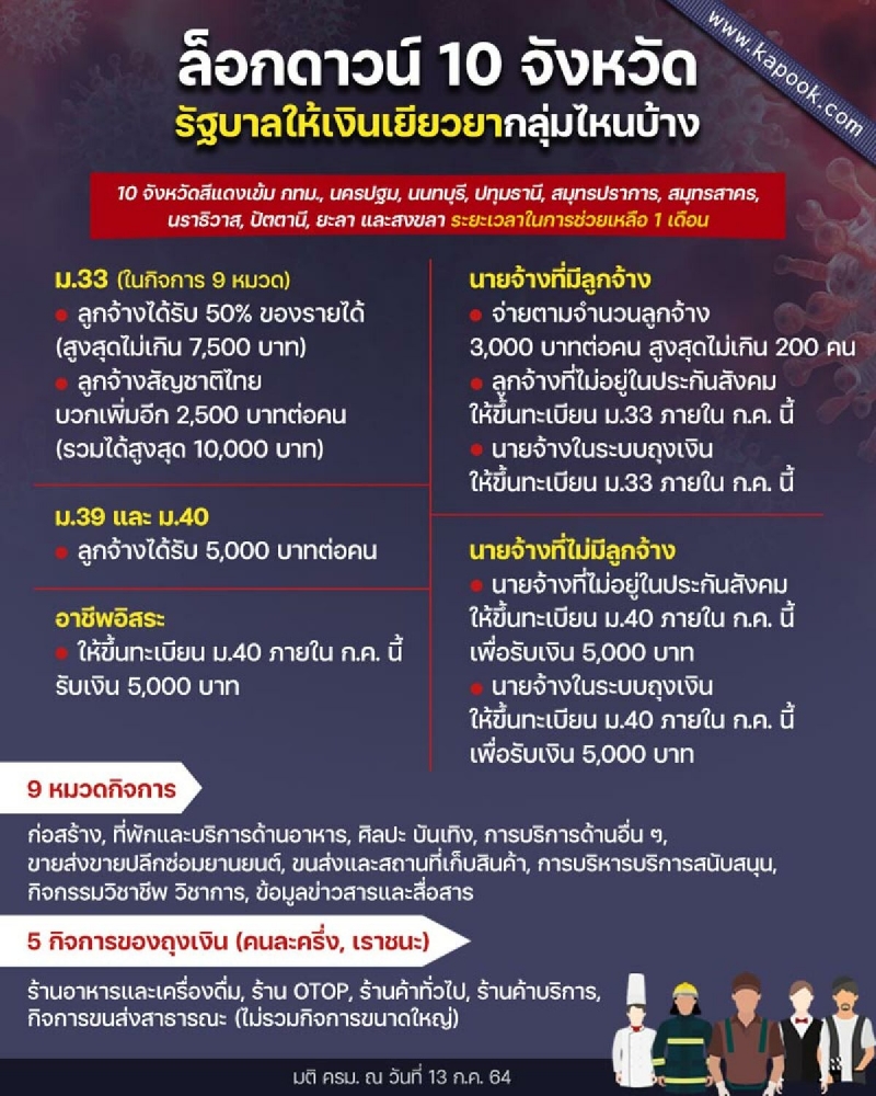1. สำหรับผู้ประกันตน ม.33 ต้องเป็นลูกจ้างในหมวด 9 กิจการที่ได้รับผลกระทบ โดยลูกจ้างจะได้รับเงินชดเชย จำนวน 50% ของรายได้ สูงสุดไม่เกิน 7,500 บาท และรัฐบาลจ่ายเพิ่มเติมให้ลูกจ้างสัญชาติไทย 2,500 บาทต่อคน ทำให้จะได้รับเงินสูงสุด 10,000 บาทต่อคน