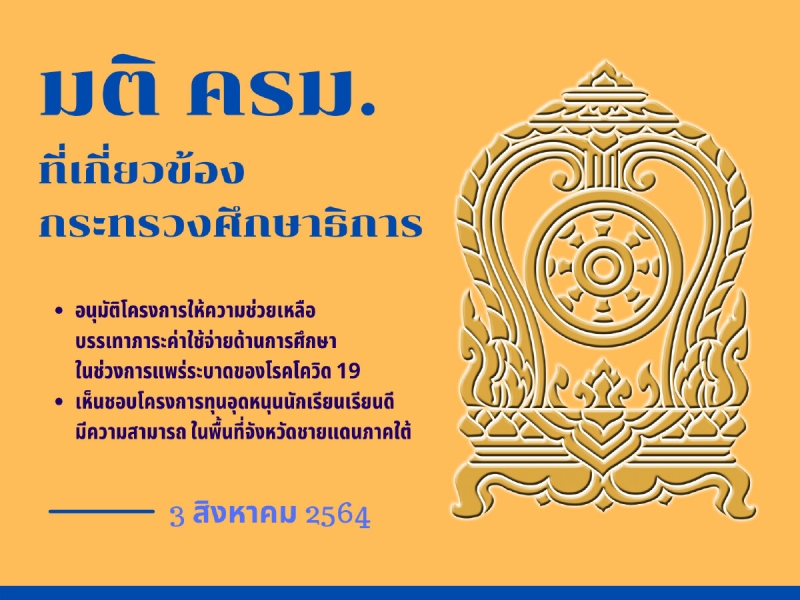 จากมติคณะรัฐมนตรี เมื่อวันที่ 3 สิงหาคม 2564 ที่เกี่ยวข้องกับกระทรวงศึกษาธิการ อนุมัติโครงการให้ความช่วยเหลือบรรเทาภาระค่าใช้จ่ายด้านการศึกษา ในช่วงการแพร่ ร ะ บ า ด ของ โ ร ค โ ค วิ ด-19 ซึ่งผ่านการพิจารณาของคณะกรรมการกลั่นกรองการใช้จ่ายเงินกู้