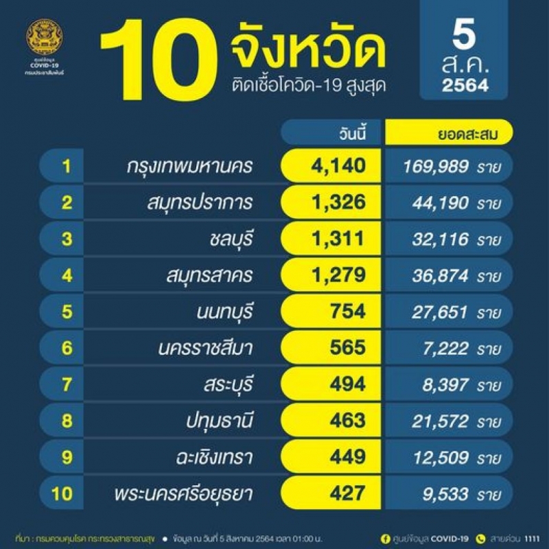 วันนี้ ( 5 สิงหาคม 2564 ) เพจเฟซบุ๊ก ศูนย์ข้อมูล C O V I D -19 ได้โพสต์ข้อความว่า 10 อันดับจังหวัดที่มีจำนวนผู้ติด เ ชื้ อ โ ค วิ ด -19 ในประเทศรายใหม่สูงสุด แหล่งข้อมูล กรมควบคุม โ ร ค กระทรวงสาธารณสุข วันพฤหัสบดีที่ 5 สิงหาคม 2564 ณ เวลา 01:00 น