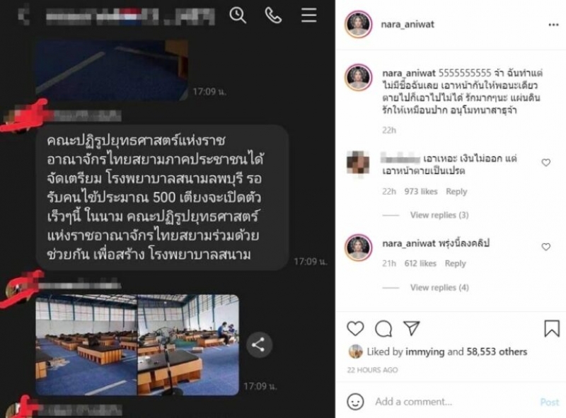 ล่าสุด นารา ก็ได้โพสต์ภาพแชตไลน์และข้อความผ่านอินสตาแกรมส่วนตัว ซึ่งมีการส่งรูป รพ.สนาม ที่ตนเองสร้าง พร้อมระบุว่าโรงพยาบาลสนามลพบุรี กำลังจะเปิดตัวในเร็วๆ นี้ ในนามคณะปฏิรูปยุทธศาสตร์แห่งราชอาณาจักรไทยสยามภาคประชาชน ซึ่งนารา ระบุแคปชั่นว่า 5555555555 จ้า ฉันทำแต่ไม่มีชื่อฉันเลย เอาหน้ากันให้พอนะเดี่ยว...ไปก็เอาไปไม่ได้ รักมากๆนะ แผ่นดิน รักให้เหมือน ปา ก อนุโมทนาสาธุจ้า